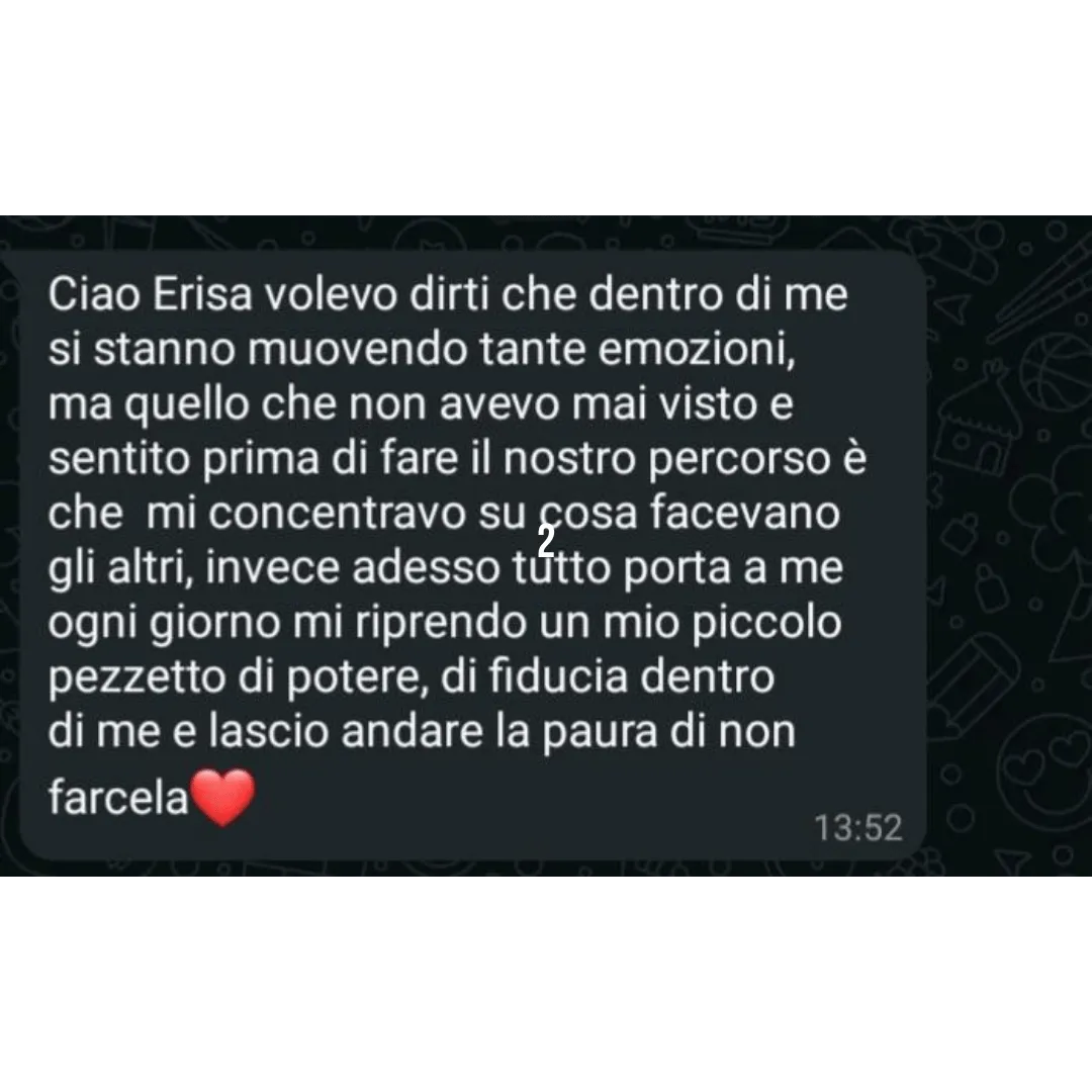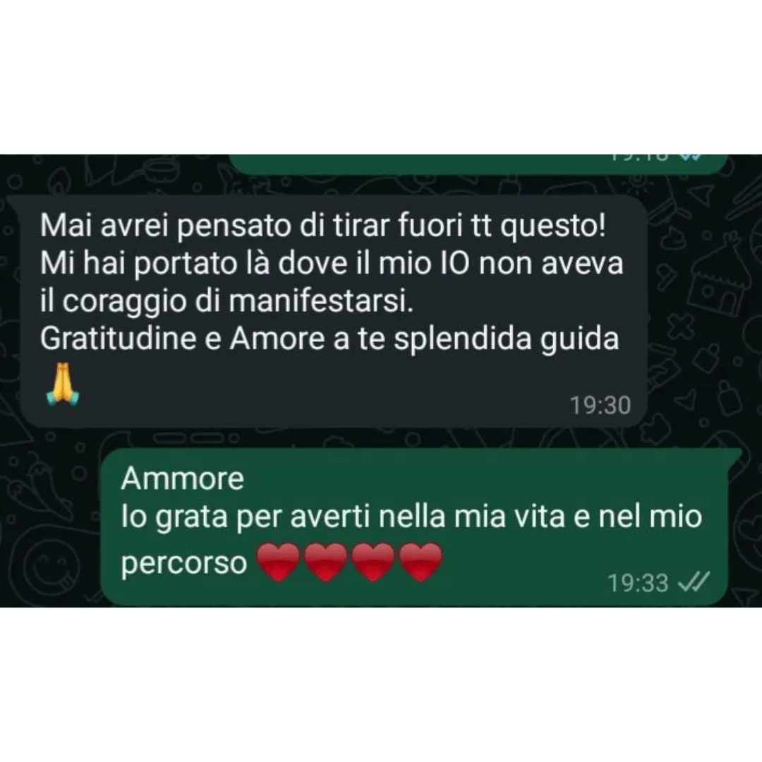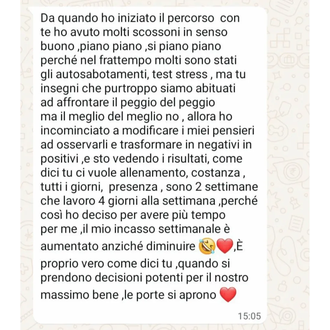 Grazie al tuo percorso mi sono resa conto che avevo tanti autosabottamenti. Subito dal primo mese ho iniziato a vedere già dei grossi miglioramenti...